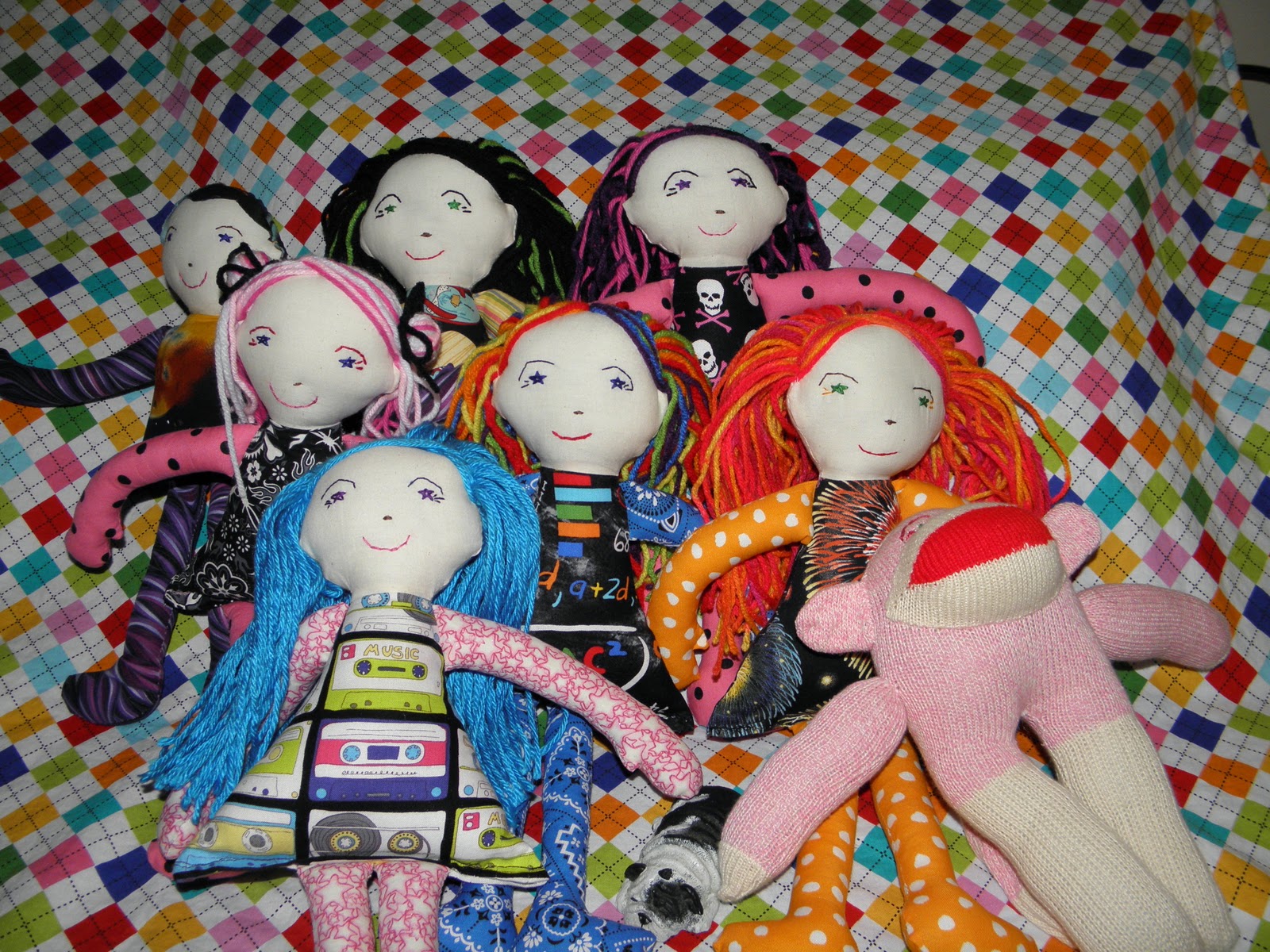 Starry Eyed Raggedy Rebel Goth with Skulls and Pink Highlights and Blaze, the Flaming Heart Tattooed Red Head Punk Sock Monkey Doll are my favorites.